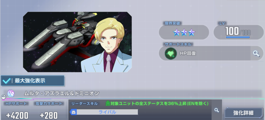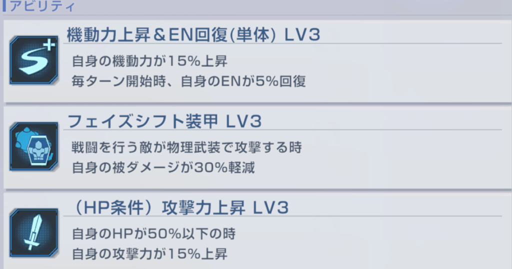 ・自身の機動力15%アップ、毎ターン開始時に自身のEN5%回復
