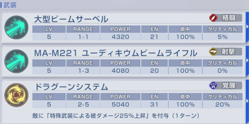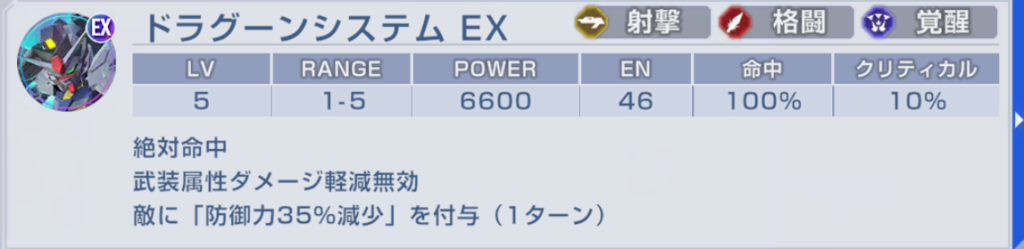 特殊&覚醒属性の通常ドラグーンシステム、射程2~5、威力5040、消費EN31、クリティカル率20%