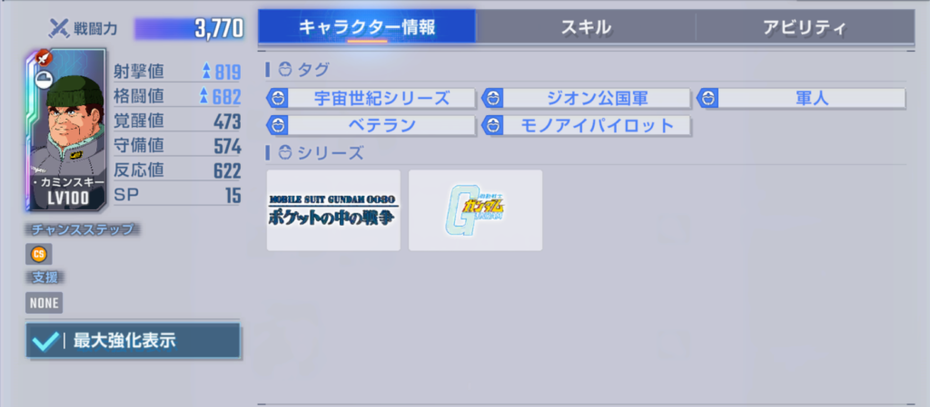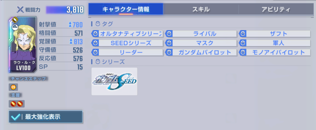 ステータスは射撃値780、格闘値571、覚醒値813、守備値526、反応値576