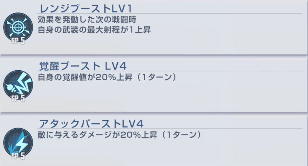 キャラクタースキルはレンジブーストLV1、覚醒ブーストLV4、アタックバーストLV4