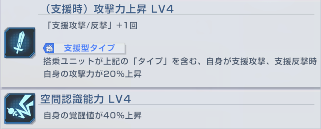 ・支援攻撃+1回、支援型ユニットに搭乗時に支援攻撃時の攻撃力が20%アップ