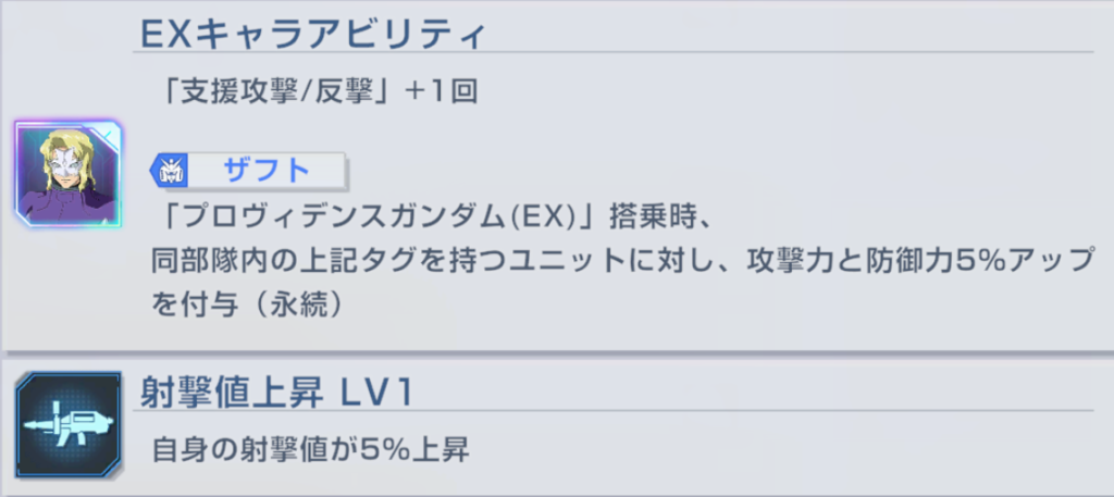 ・支援攻撃+1回、プロヴィデンスガンダムEXに搭乗時