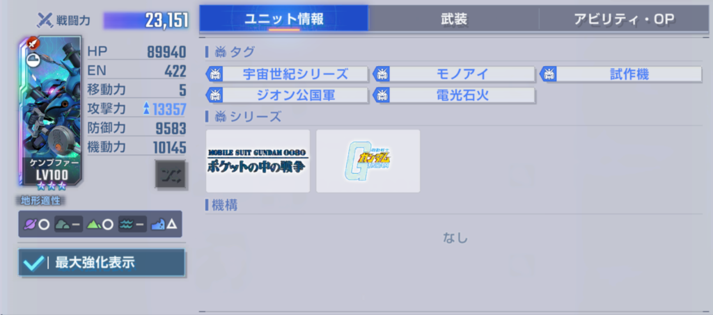 ステータスはHP100951、EN443、移動力5、攻撃力10658、防御力9010、機動力11521