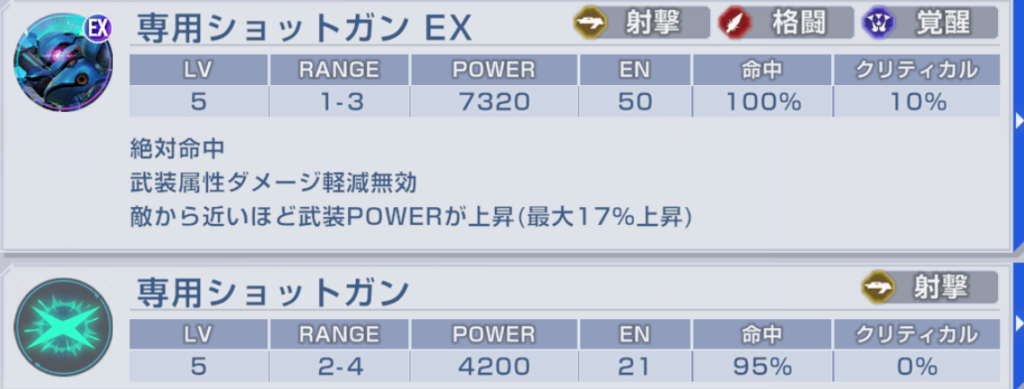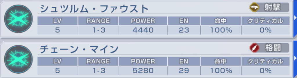 射程1~3、威力7320、消費EN50、クリティカル率10%