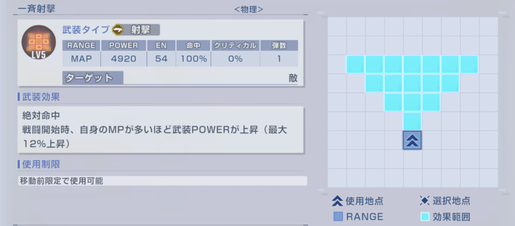 物理&射撃属性のマップ兵器、一斉射撃、範囲は4マス先まで届く扇型範囲