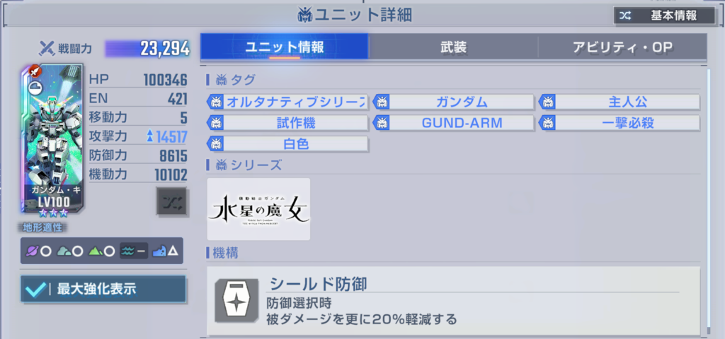 ステータスはHP100346、EN421、移動力5、攻撃力14517、防御力8615、機動力10102