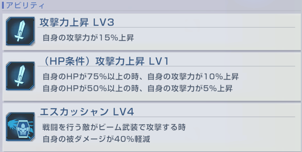・自身のHPが75%以上の時、自身の攻撃力10%アップ
