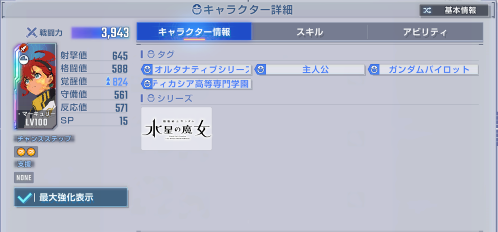 ステータスは射撃値645、格闘値588、覚醒値824、守備値561、反応値571