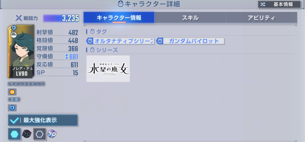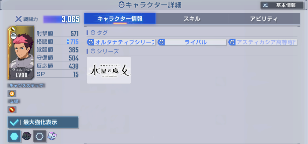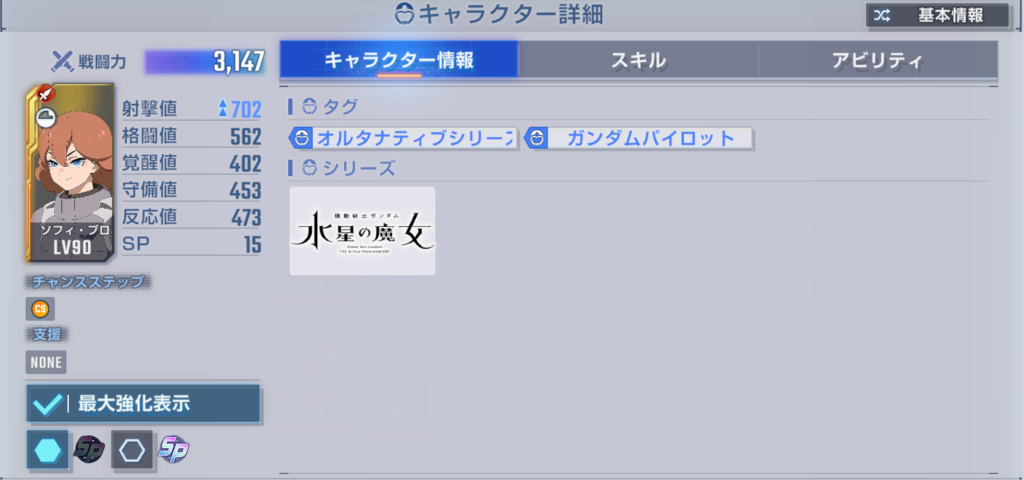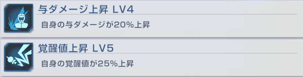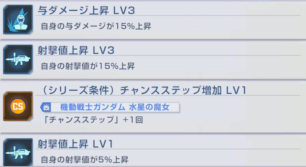 スレッタのキャラスキルはレンジブーストLV1、覚醒ブーストLV5、HPリペアLV4