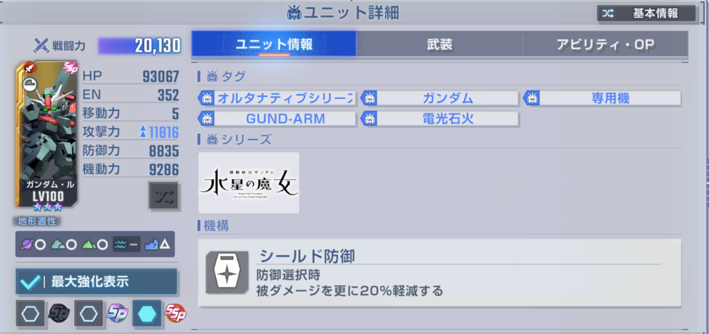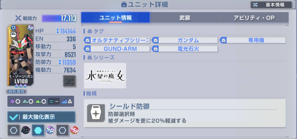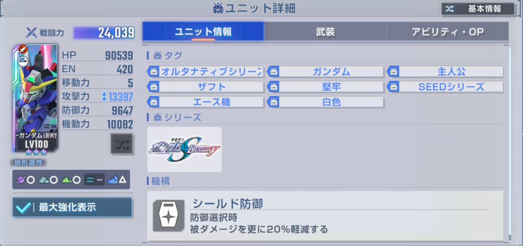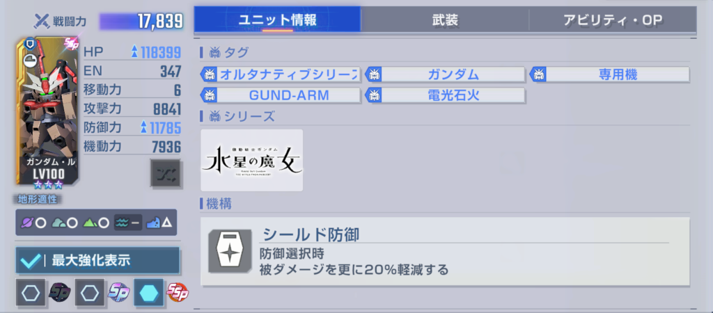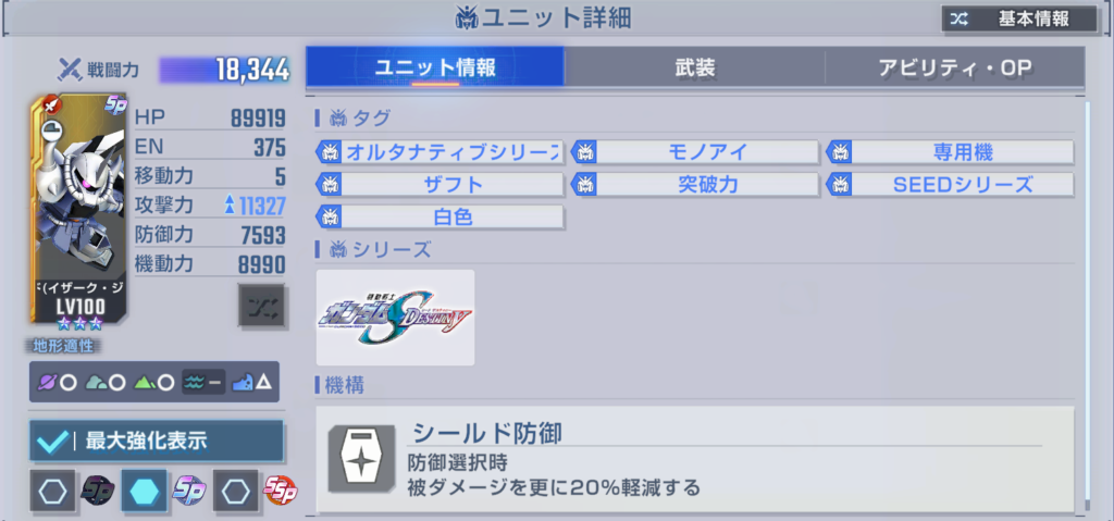 地形適性は宇宙、空中、地上が〇、水中が△、シールド有りとなっております