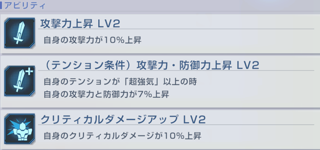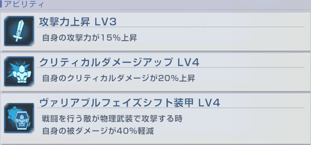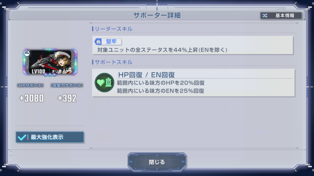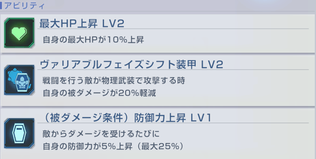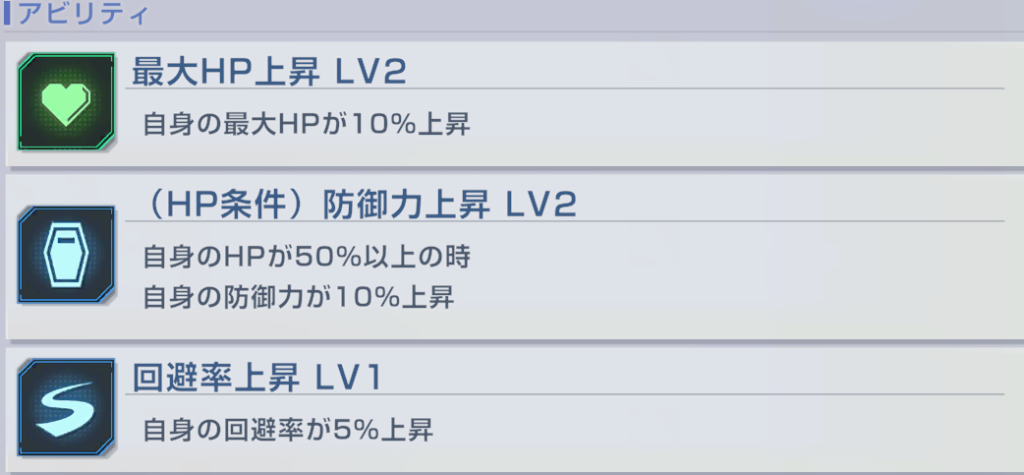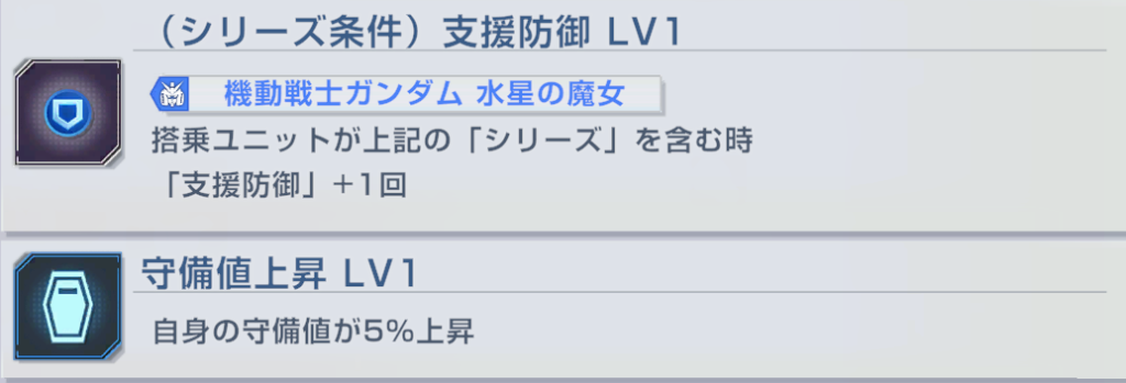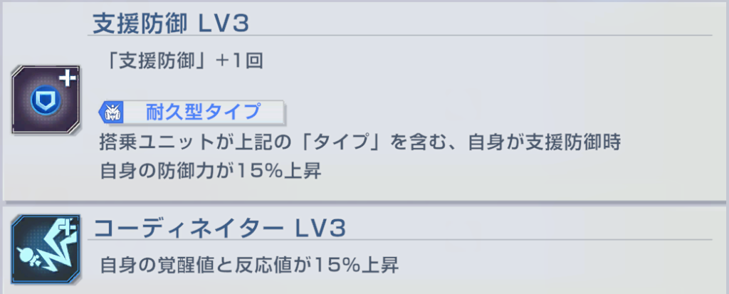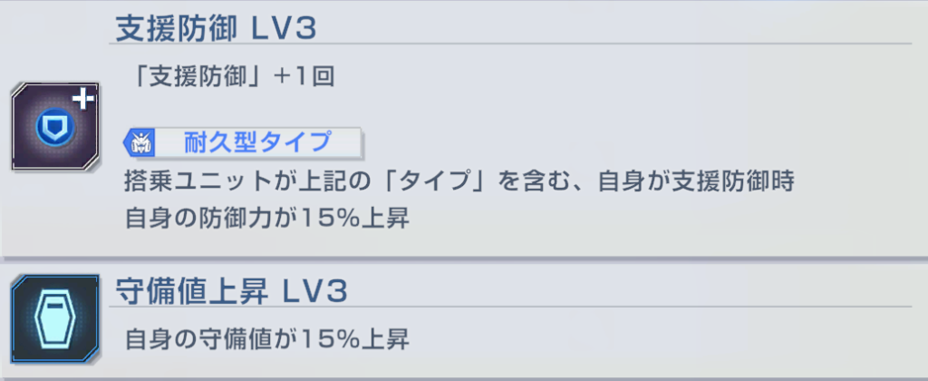 耐久型ユニットに搭乗時、自身の支援防御時に防御力15%アップ