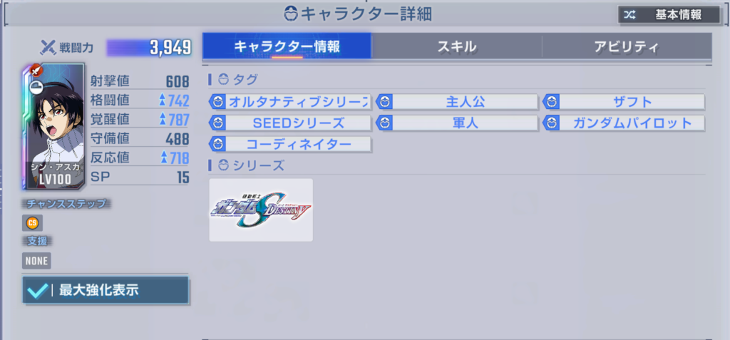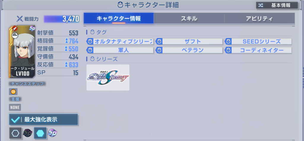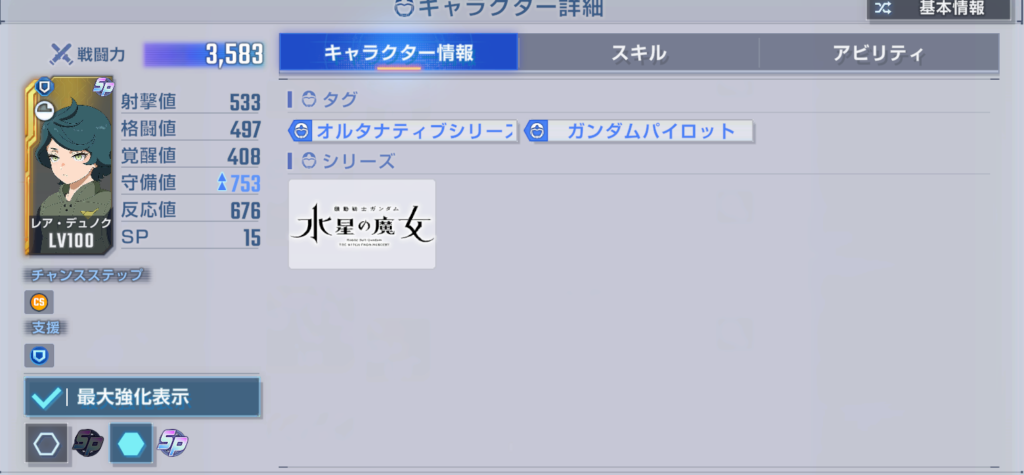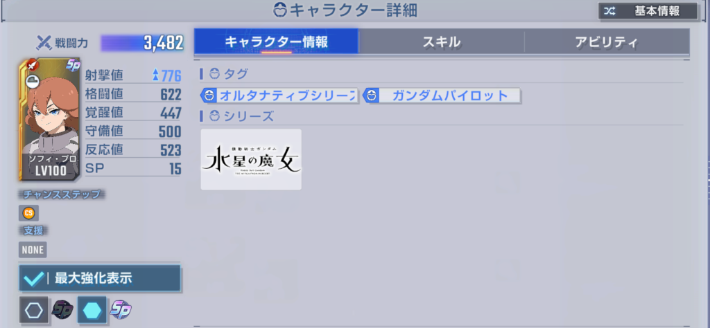 SP化時のステータスは射撃値475、格闘値500、覚醒値496、守備値747、反応値726