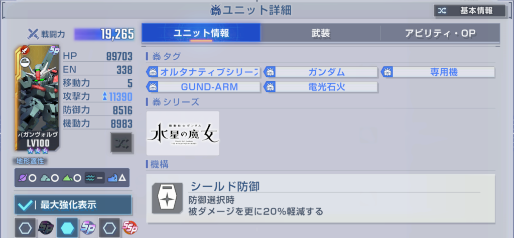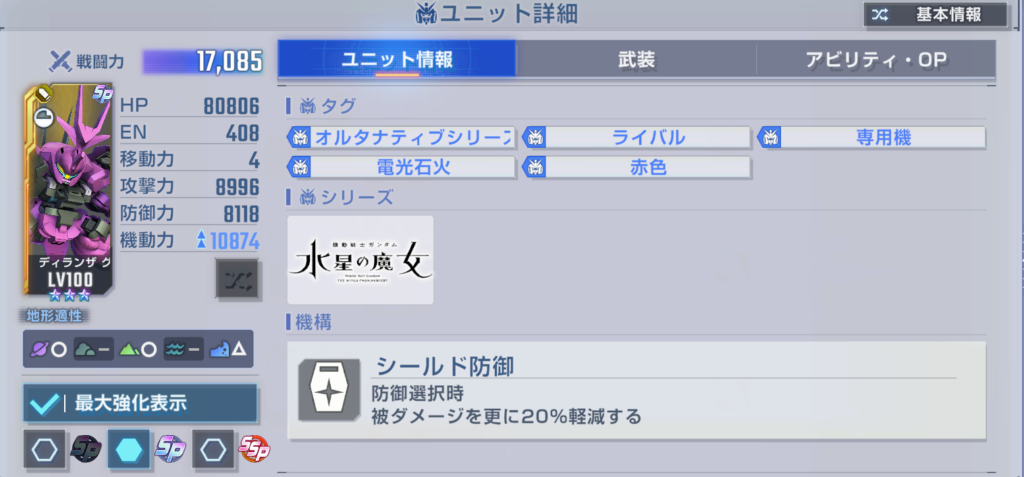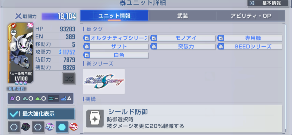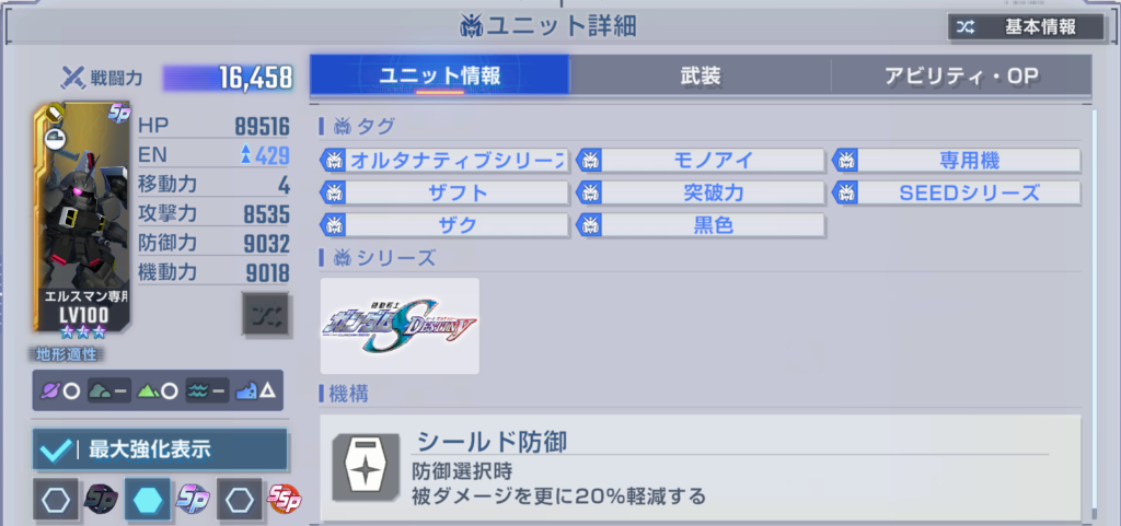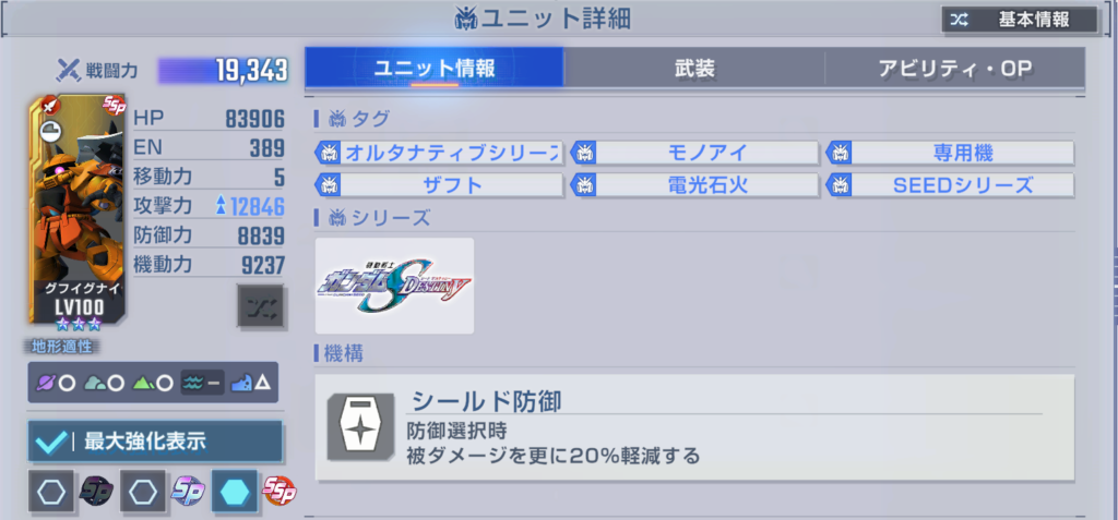 SSP化時のステータスはHP83906、EN389、移動力5、攻撃力12846、防御力8839、機動力9237