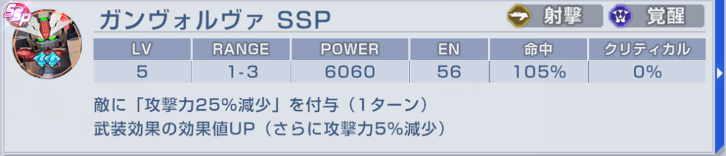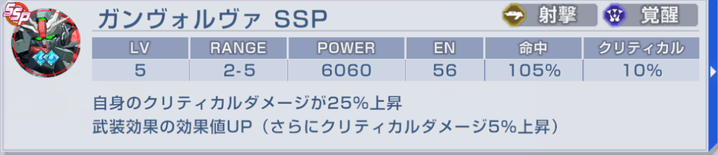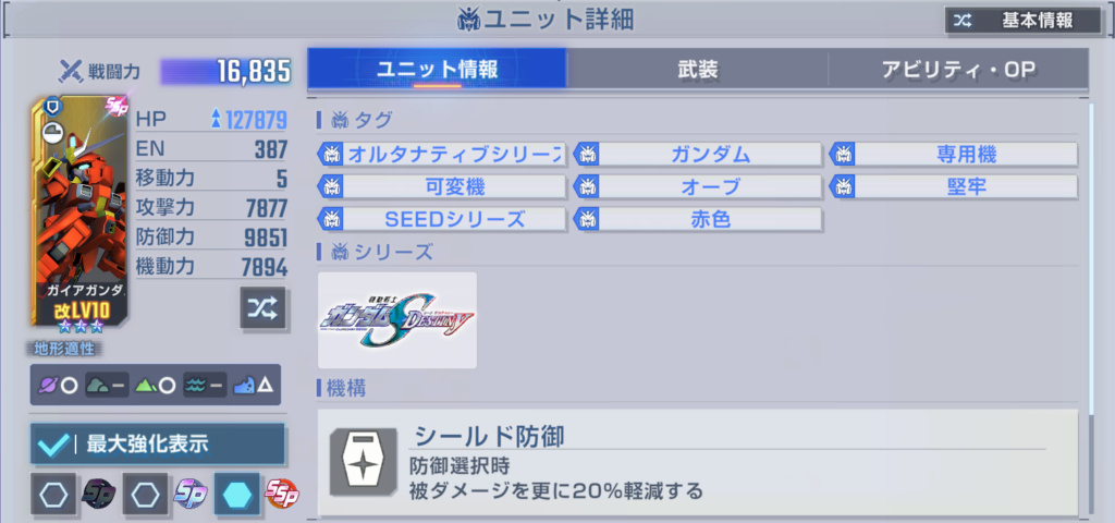SSP化時のステータス、HP127879、EN387、移動力5、攻撃力7877、防御力9851、機動力7894