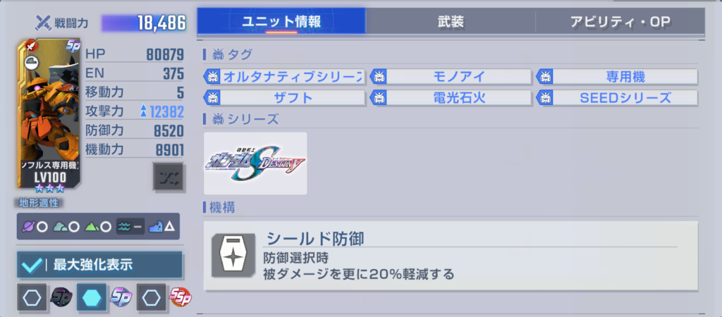 SP化時のステータスはHP80879、EN375、移動力5、攻撃力12382、防御力8520、機動力8901