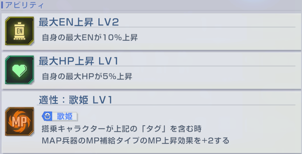 ・【歌姫】タグ持ちのキャラ搭乗時、MPアップ系のマップ兵器のMPアップ量が+2