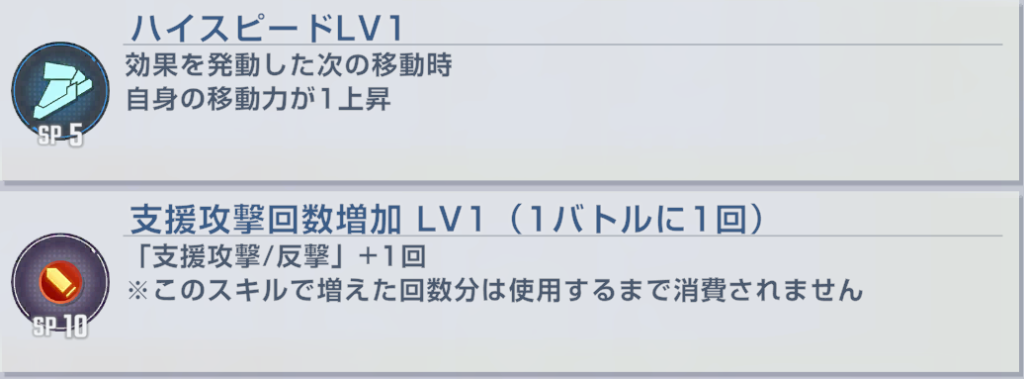 キャラスキルはハイスピードLV1、支援攻撃回数増加LV1