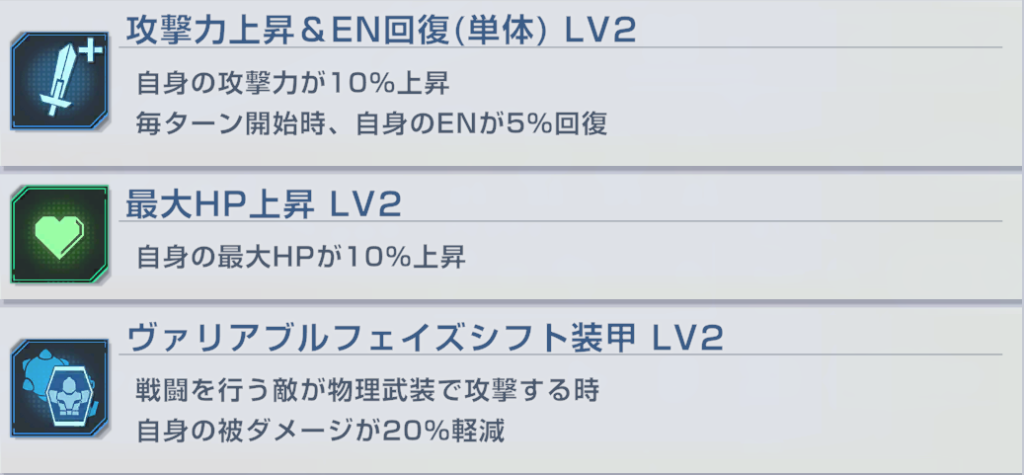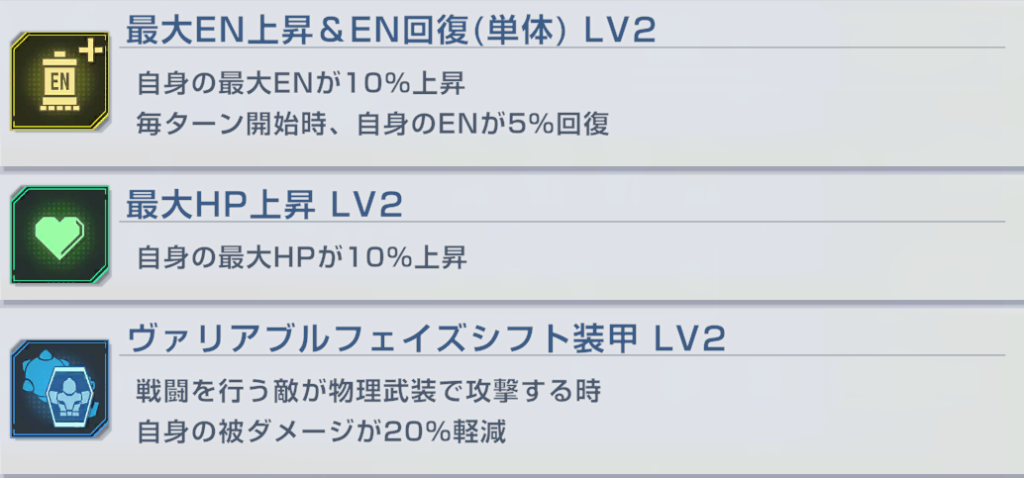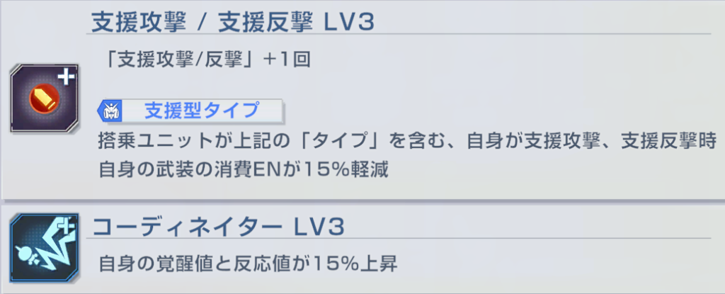 ・支援攻撃/反撃+1回、支援型ユニット搭乗時に自身の支援攻撃/反撃時の武装消費EN15%軽減