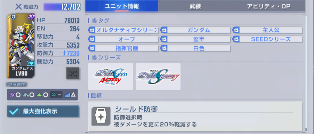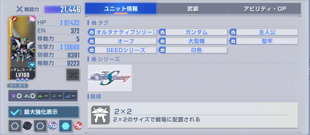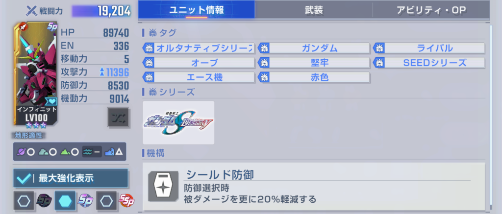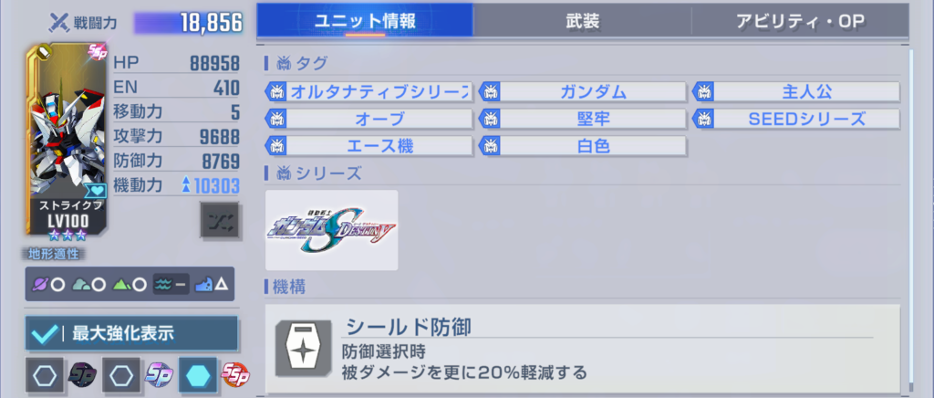 SSP化時のステータス、HP88575、EN466、移動力5、攻撃力9370、防御力8323、機動力10190