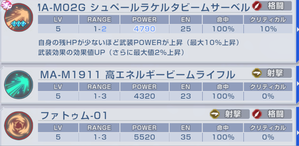 ただサーベルとSSP武装の武装効果が残HPが少ないほど威力アップの仕様