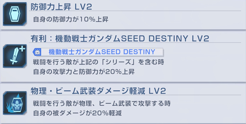 ・シリーズ【SEED DESTINY】のユニットとの戦闘時、自身の攻撃力と防御力が〇%アップ