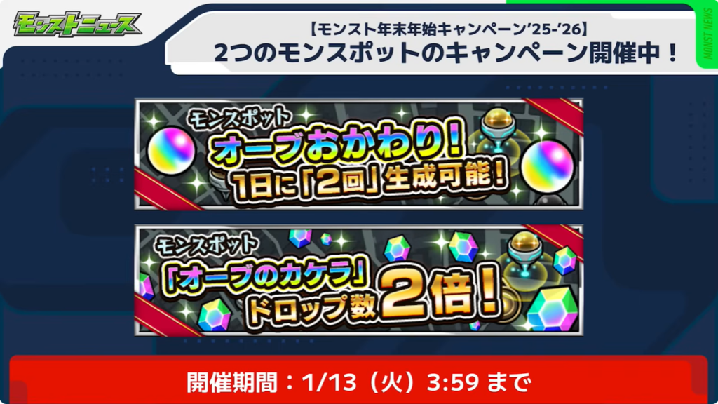 モンスポットのオーブ生成数とオーブのカケラドロップ数2倍のキャンペーン開催