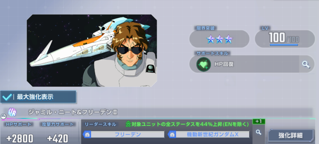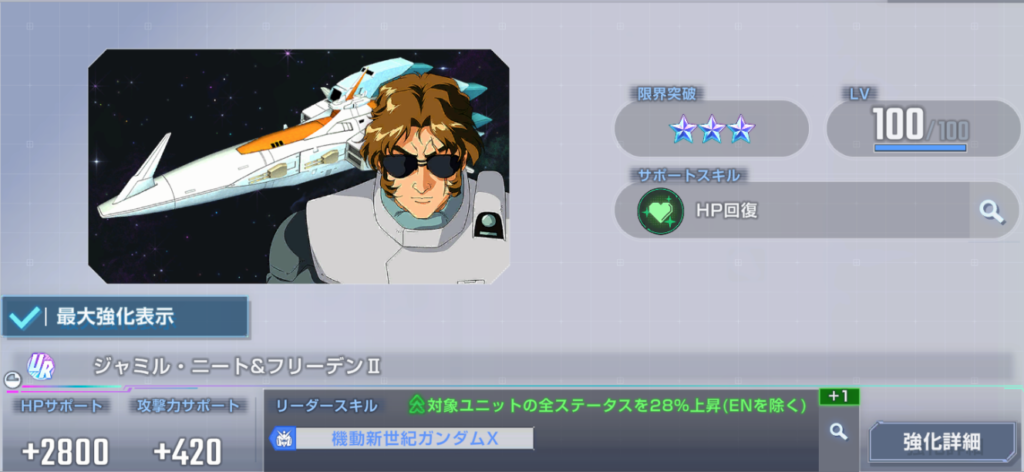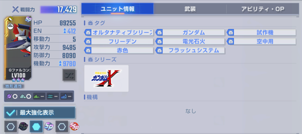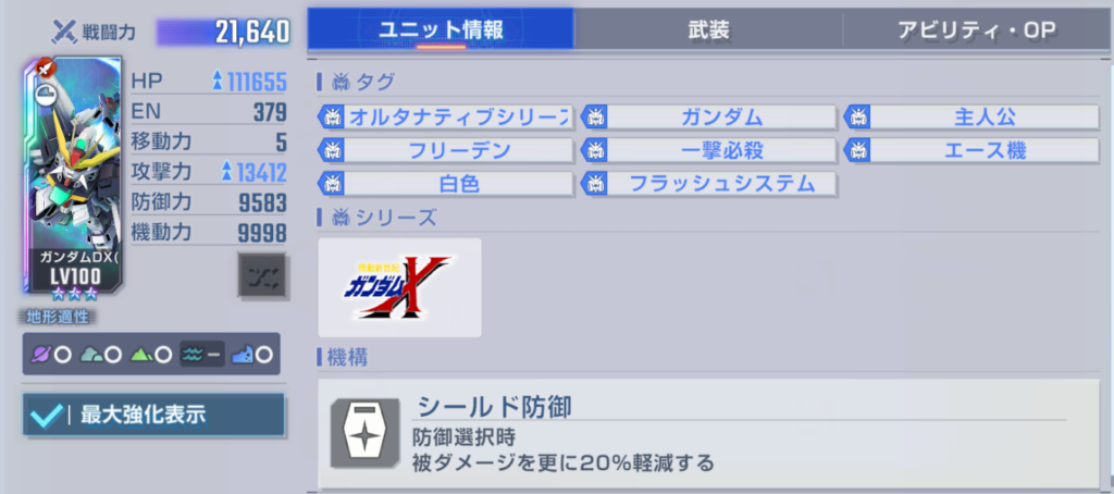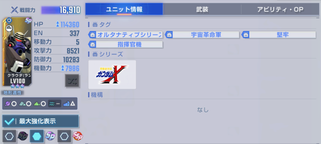 最大強化時のステータスはHP111655、EN379、移動力5、攻撃力13412、防御力9583、機動力9998