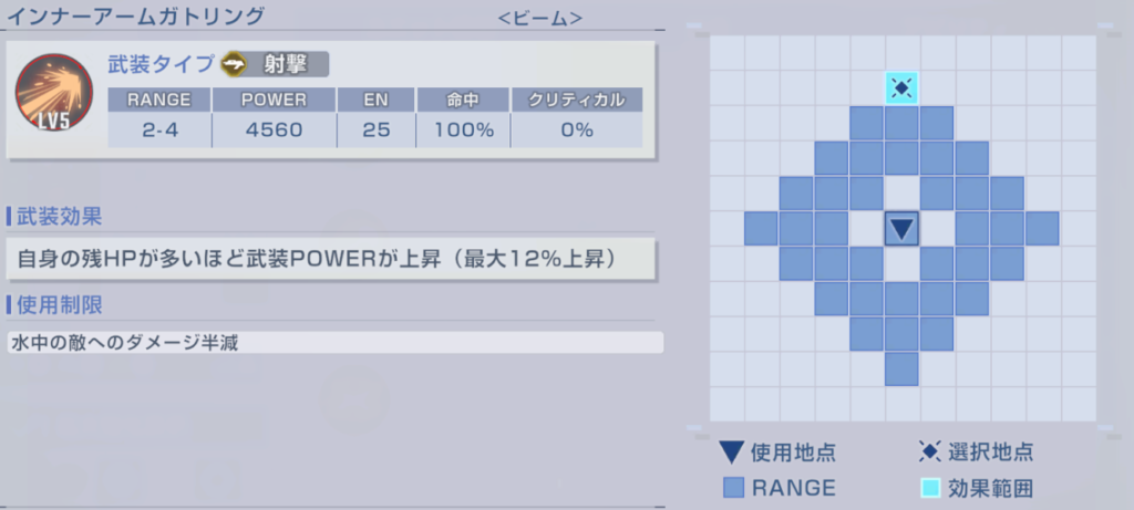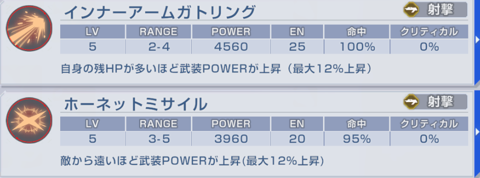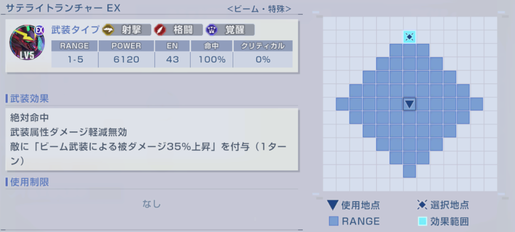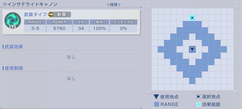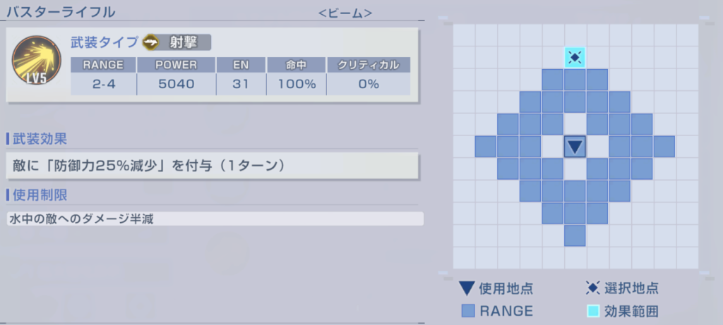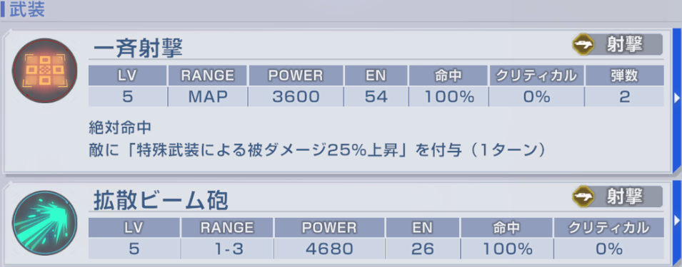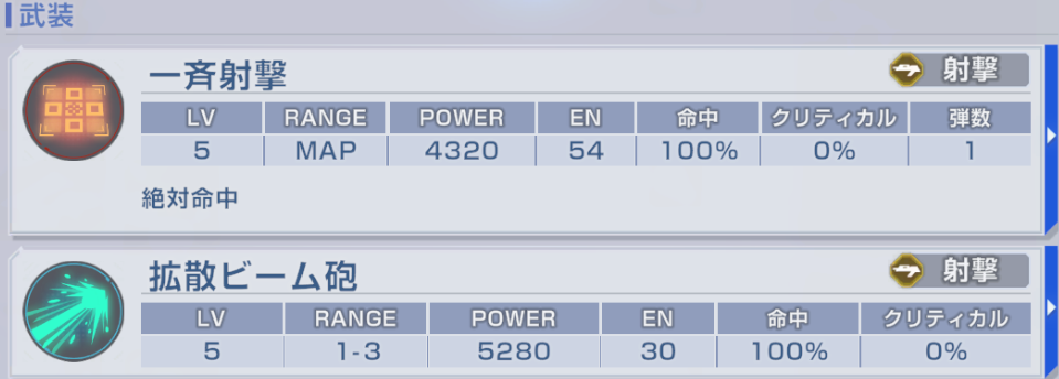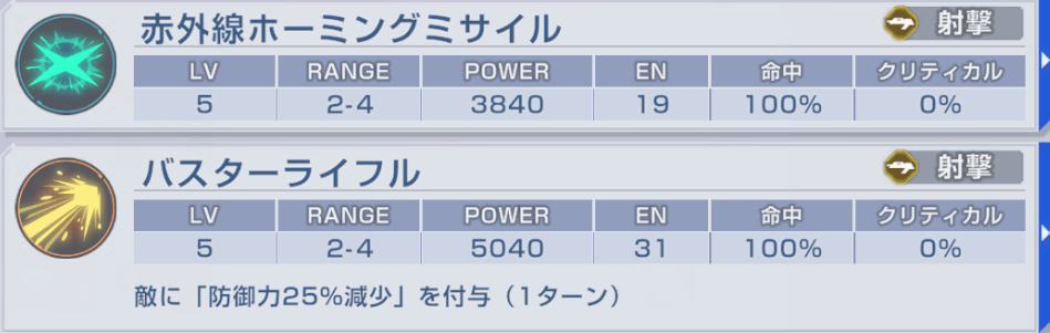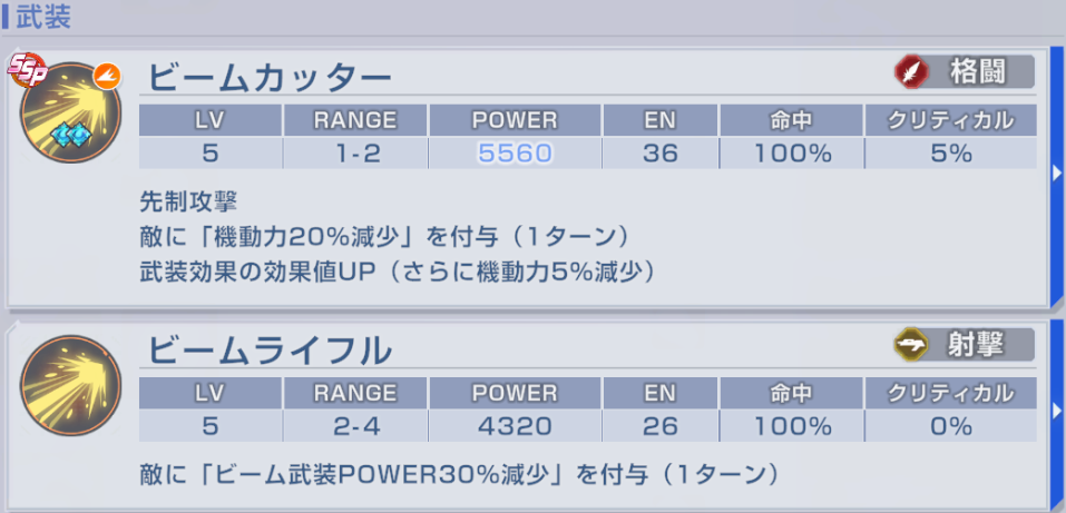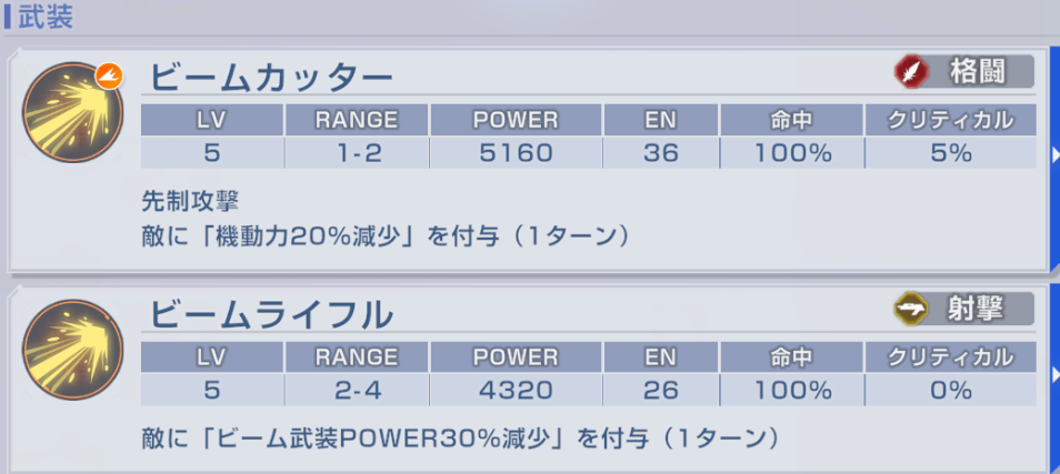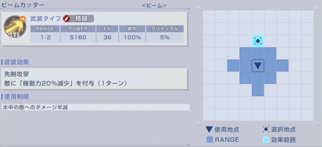 射程1~2、威力5160、消費EN36、クリティカル率5%