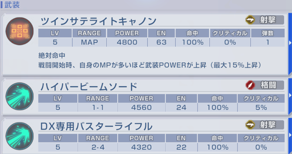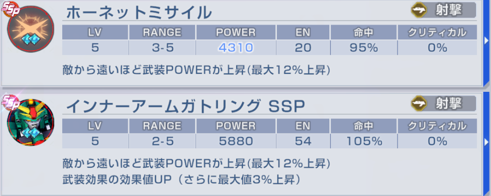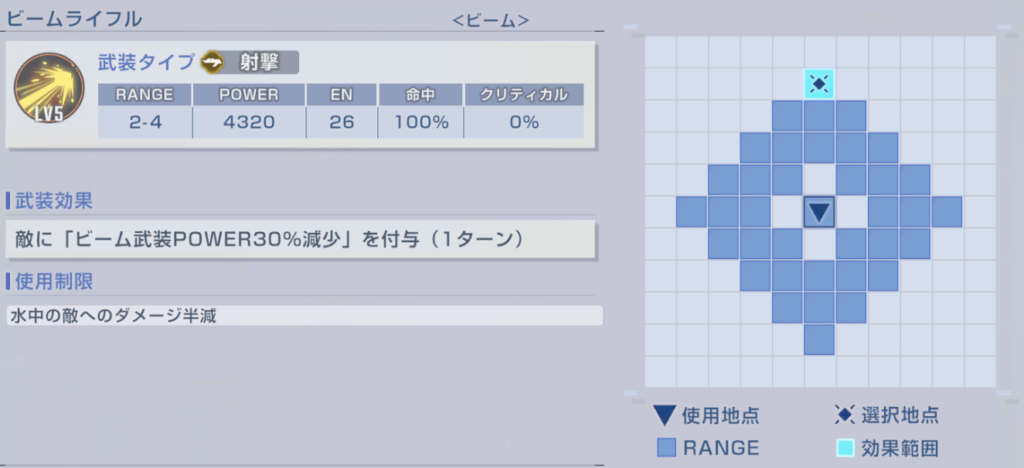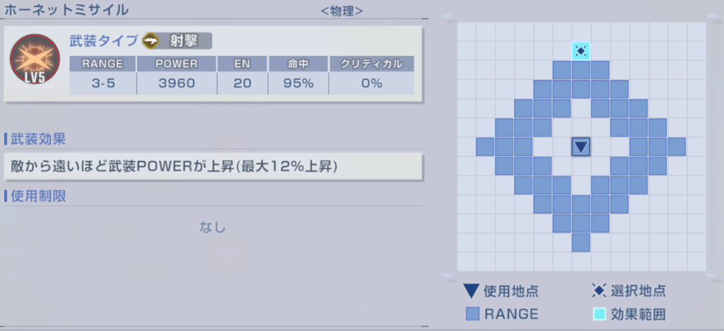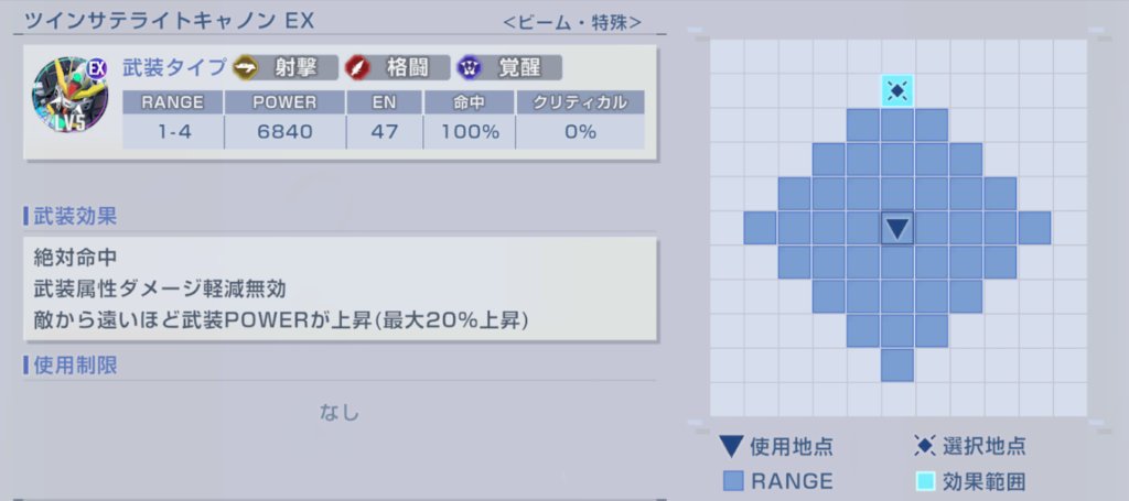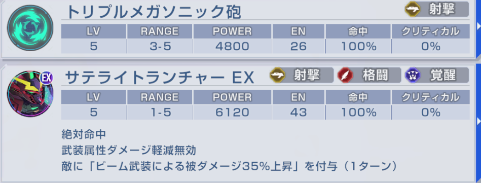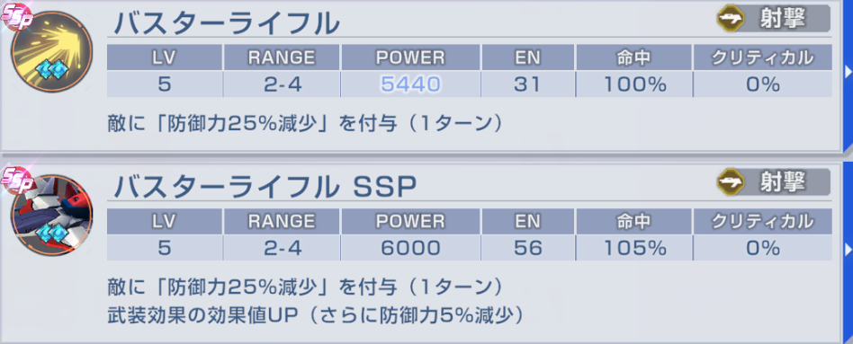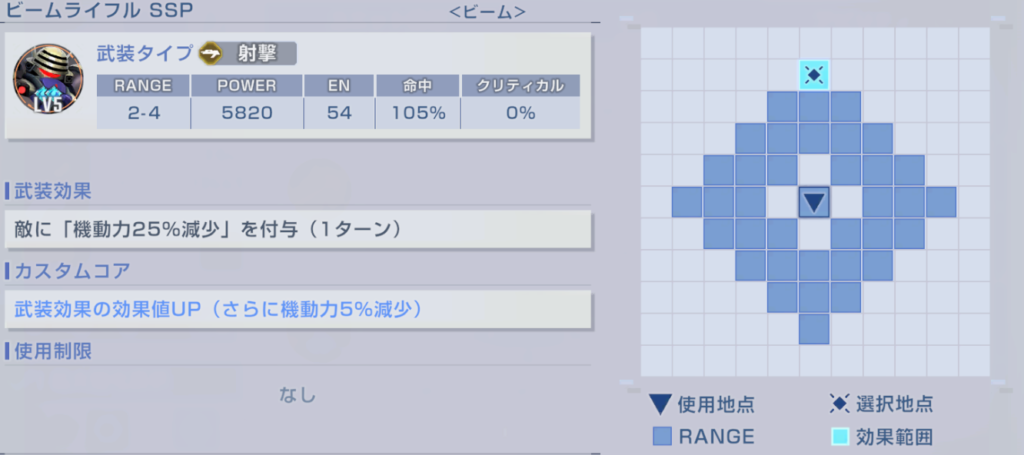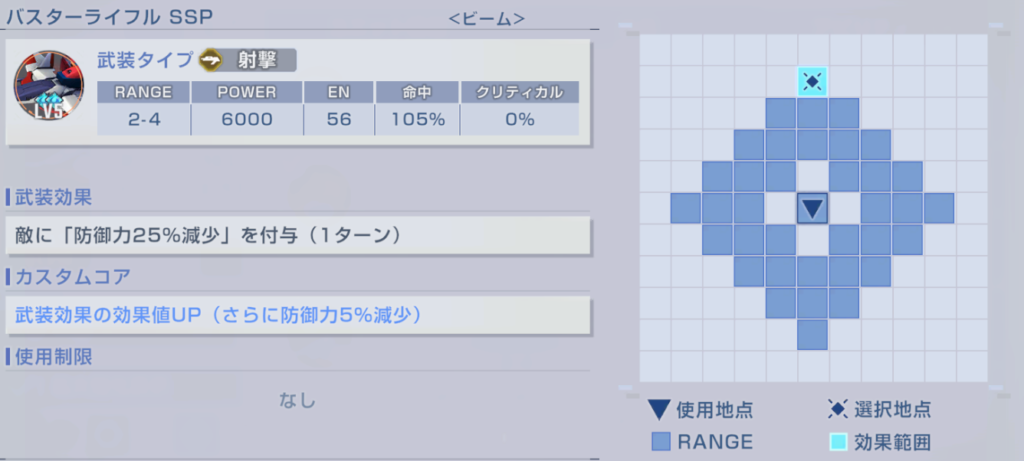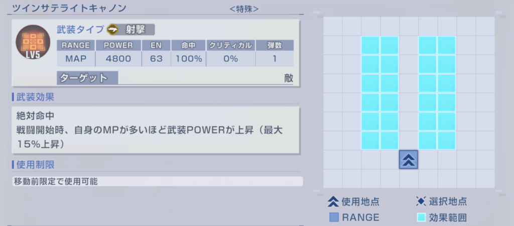 射程1~2、威力5160、消費EN36、クリティカル率5%