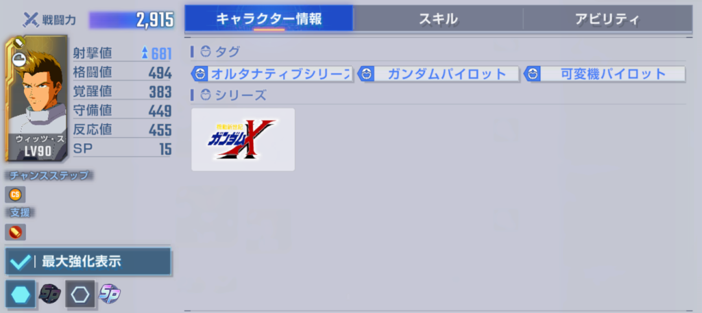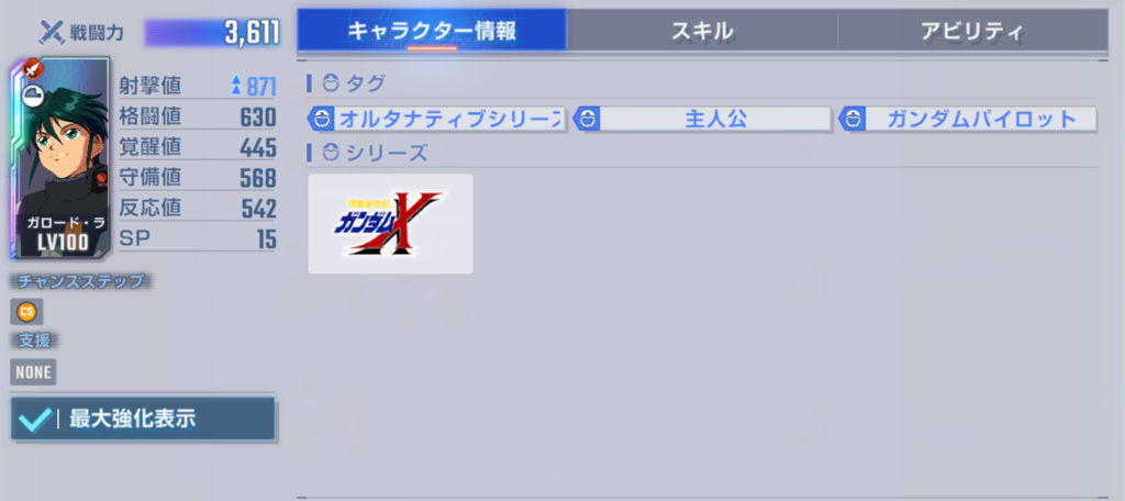 最大レベルのステータスは射撃値871、格闘値630、覚醒値445、守備値568、反応値542