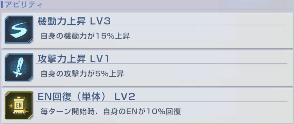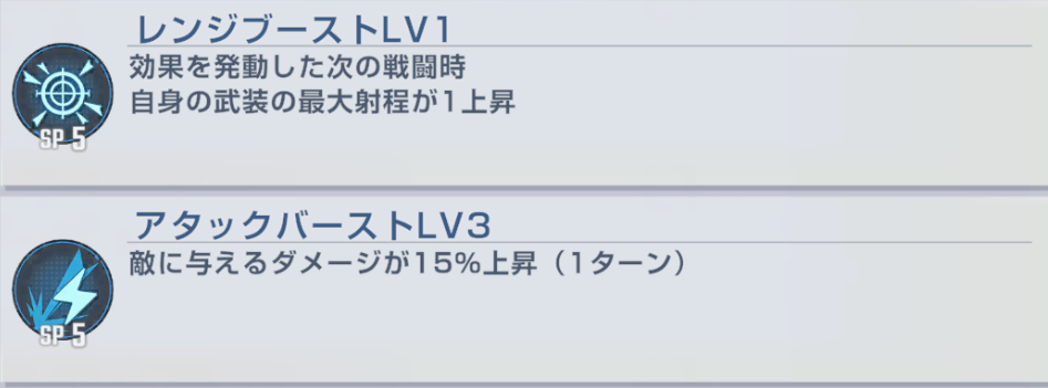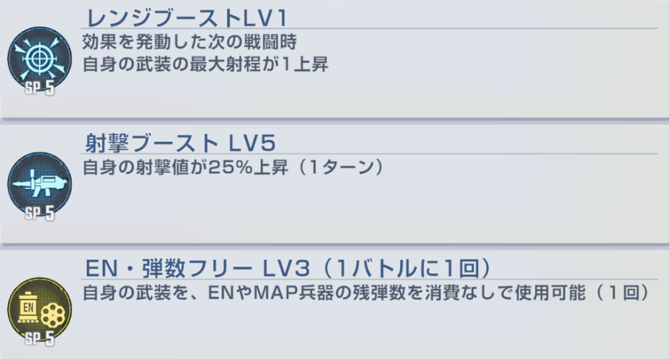 キャラスキルはレンジブーストLV1、射撃ブーストLV5、EN・弾数フリーLV3(1バトルに1回)