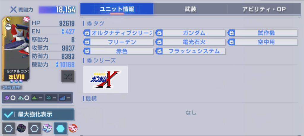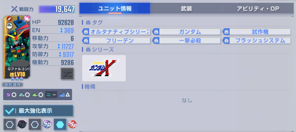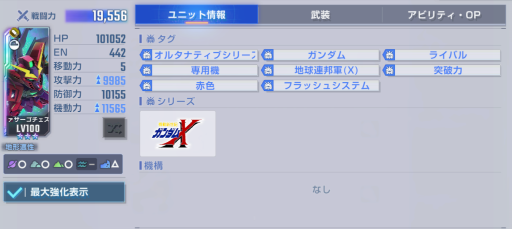 最大強化時のステータスはHP101052、EN442、移動力5、攻撃力9985、防御力10155、機動力11565