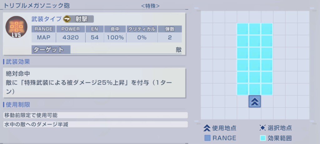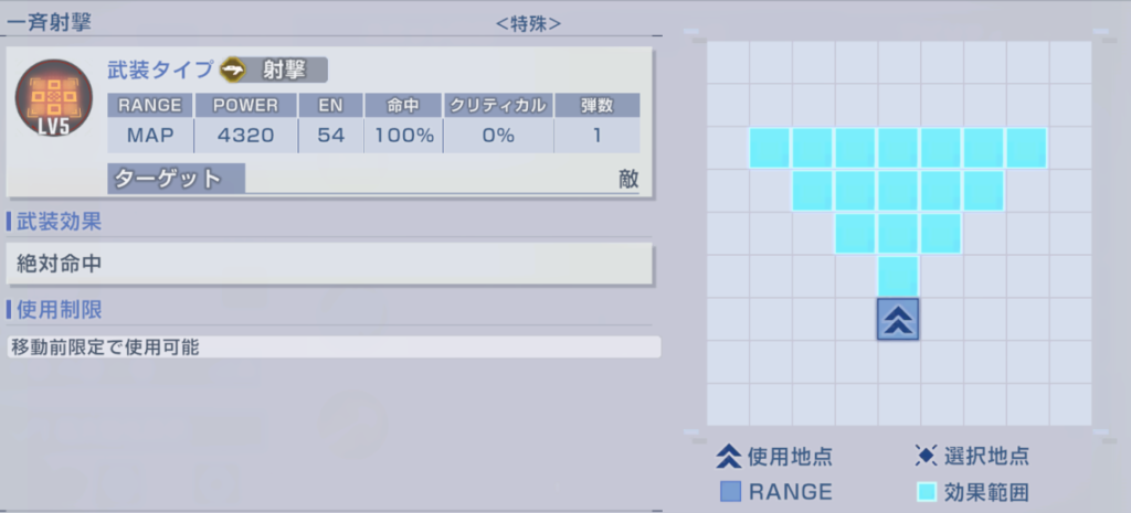 範囲は前方3×6マス、威力4320、消費EN54、弾数2