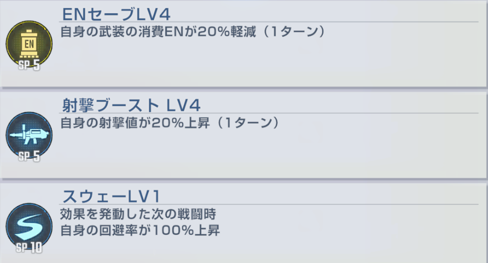 ・EN消費なし、マップ兵器弾数消費なしにできるスキルを1回使用可能