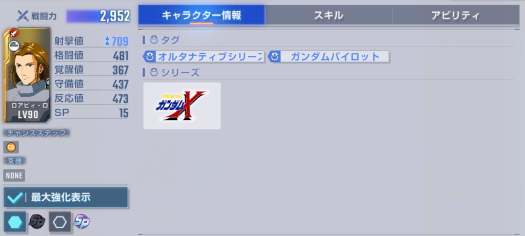 最大レベルでのステータスは射撃値709、格闘値481、覚醒値367、守備値437、反応値473