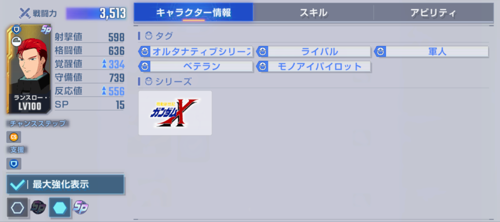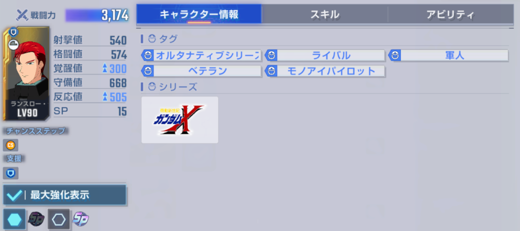 最大レベルでのステータスは射撃値540、格闘値574、覚醒値300、守備値668、反応値505