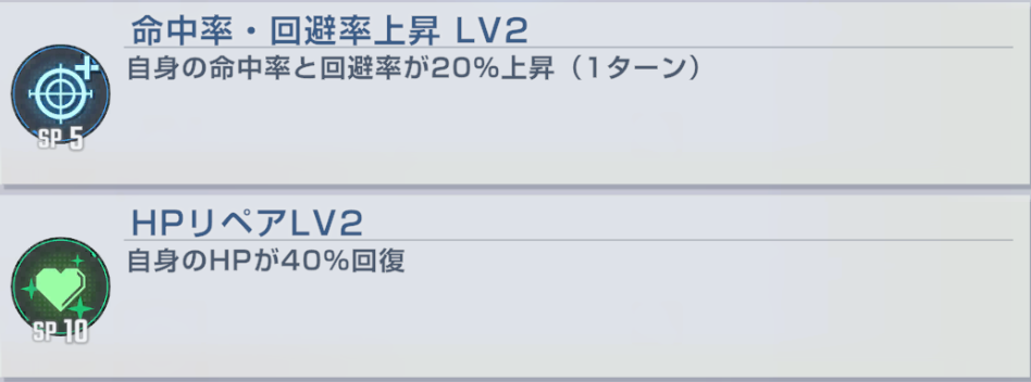 キャラスキルは命中率・回避率上昇LV2、HPリペアLV2