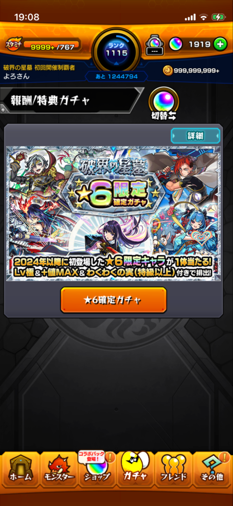 というわけで今回の破界の星墓制覇でいただきました☆6限定確定ガチャ玉
