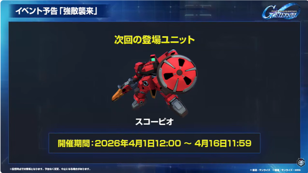 次回の強敵襲来で登場するユニットはスコーピオ、外伝作品からの登場でございます