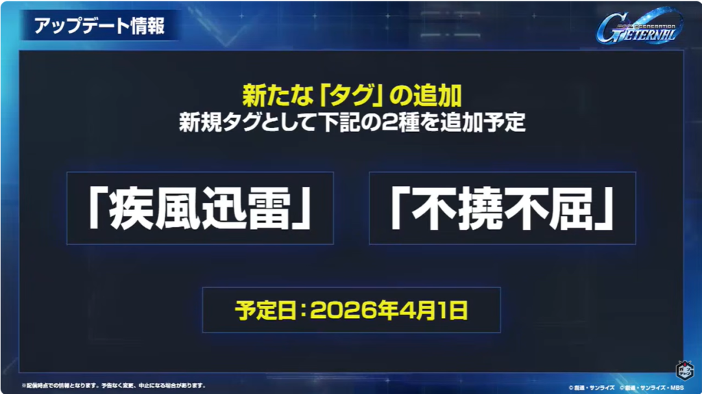 4月1日より、新しく「疾風迅雷」と「不撓不屈」のタグが追加されるとのこと