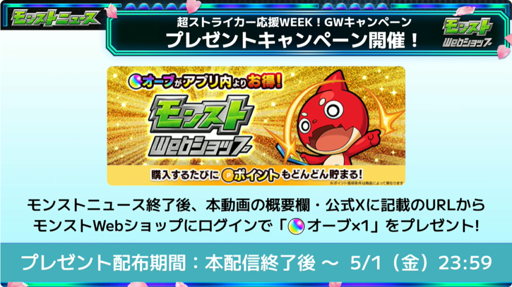 放送終了後にyoutube動画の概要欄やXのポストに記載のURLからオーブ1個をプレゼント